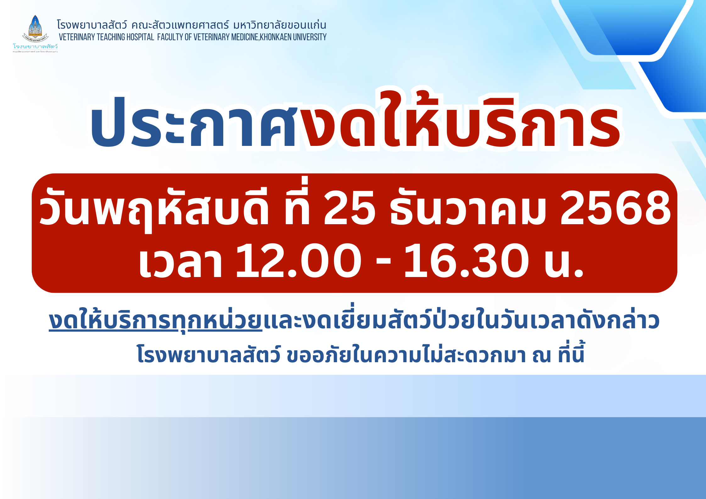 โรงพยาบาลสัตว์ คณะสัตวแพทยศาสตร์ มหาวิทยาลัยขอนแก่น งดให้บริการทุกหน่วยบริการรวมถึงหน่วยฉุกเฉินและหน่วยสัตว์ป่วยใน