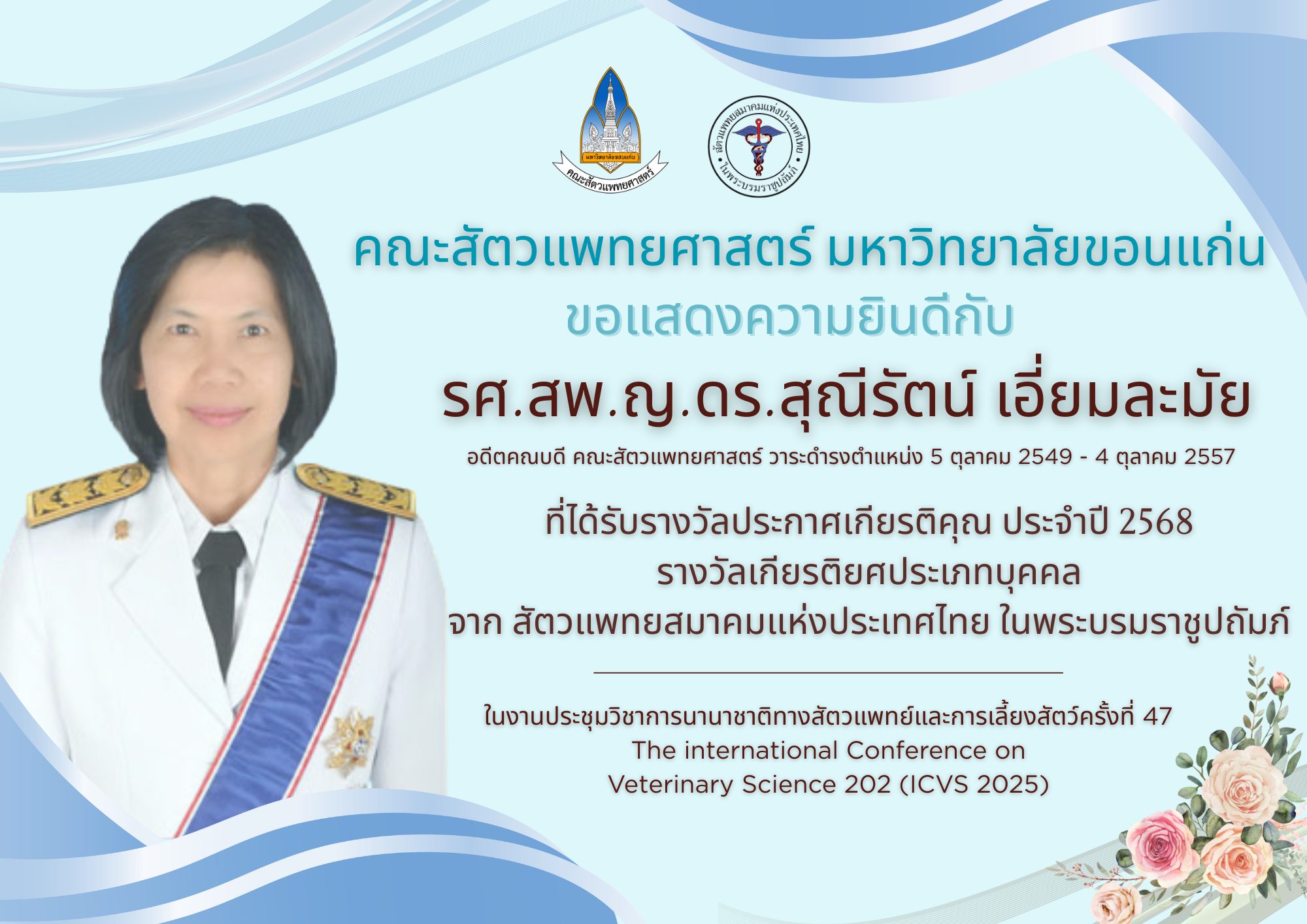 รางวัลเกียรติยศประเภทบุคคล จาก สัตวแพทยสมาคมแห่งประเทศไทย ในพระบรมราชูปถัมป์ งานประชุมวิชาการนานาชาติทางสัตวแพทย์และการเลี้ยงสัตว์ครั้งที่ 47 The international Conference on Veterinary Science 202 (ICVS 2025)